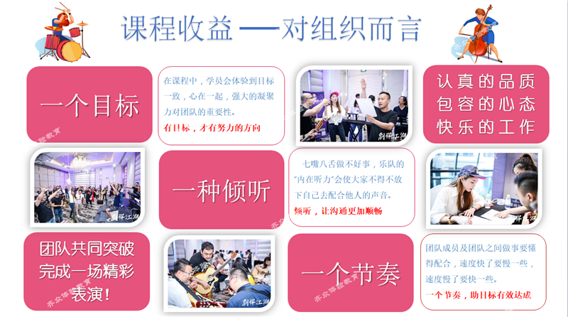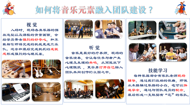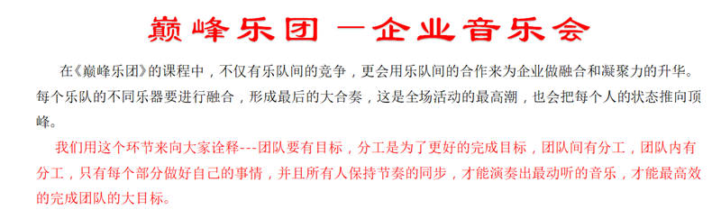 在《巅峰樂(yuè)團》的(de)課程中,不僅有(yǒu)樂(yuè)隊間的(de)競争,更會用樂(yuè)隊間的(de)合作來為(wèi)企業做(zuò)融合和(hé)凝聚力的(de)升華。